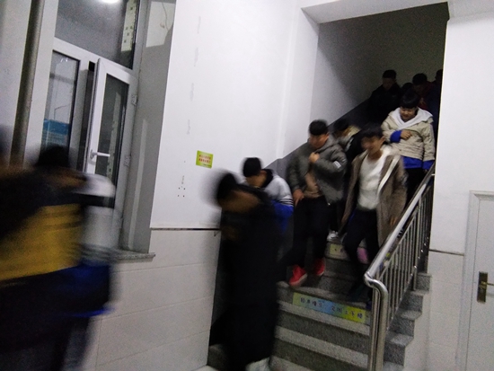 伴随警报声突然响起,同学们接到演习指令,立刻迅速撤离,消防演练宣告正式开始。火灾源烟雾升起,楼层疏导老师迅速组织住寝学生按照指定安全通道迅速撤离。同学们按要求,用湿毛巾捂住口鼻,拿起手电筒,低姿快跑,迅速到操场指定位置集结,各寝室长立即清查人数,上报安全科朴东旭科长。整个过程用时2分35秒,其中逃离火灾现场用时1分20秒,清点人数用时1分15秒。