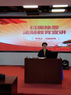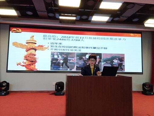 刘晶律师“以案说法”,结合近期各地学校发生的学生欺凌和校园暴力事件,深入浅出地为同学们讲解相关法律知识,还特别指出,校园抢劫、以武力强行向同学要钱,即使只要来一块钱,也是按抢劫罪论处的,16至18周岁的未成年人,如果对他人造成了重伤害,也是要负法律责任的,警示教育学生要遵法、学法、守法、用法,针对校园中易发生的校园欺凌行为向同学们介绍了预防和阻止校园欺凌的有效方法,并且倡议全校师生抵制校园黑恶和校园欺凌,共建平安校园。讲座生动有趣,学生们积极参与,增强了学生的法治观念,并取得了良好的普法效果。