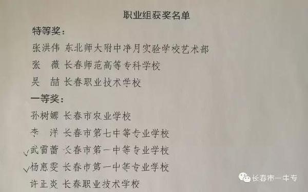 在去年12月29日由长春市教育局举办的“2016年长春市中小学(含职业学校)班主任业务能力大赛”中,长春市一中专武雷蕾、杨惠雯两位班主任均获职业组一等奖。