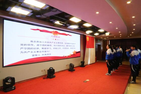 老团员在团旗下用铿锵有力的誓言重温入团誓词,表达了共青团员不忘初心跟党走,为共产主义事业奋斗的决心。