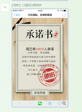 团委组织学生干部开展纪念国家公祭日线上活动 “我承诺,勿忘国耻,自强则国强” 12月13日是国家公祭日,虽然我们不能每个人都在公祭日这天到南京大屠杀纪念馆门前献上一支菊花,但是我们依然能够表达我们的哀思。让我们一起宣誓:以史为鉴,勿忘国耻!实现中华民族伟大复兴的中国梦是每一个华夏子孙的夙愿与追求,我在此承诺,以此愿景为己任,为之奋斗!