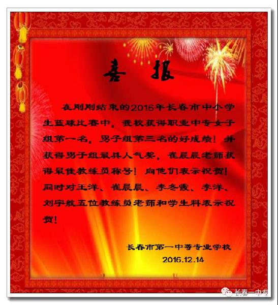 在刚刚结束的2016年长春市中小学生篮球比赛中,我校获得职业中专组女子组第一名,男子组第三名的好成绩!并获得男子组最具人气奖,崔晨晨老师获得最佳教练员称号!向他们表示祝贺!同时对教练员王洋、崔晨晨、李冬霞、李洋、刘宇航五位老师和学生科表示祝贺!