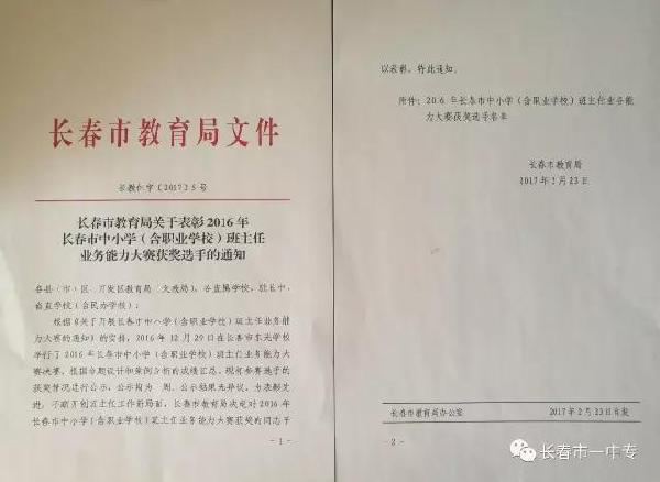 在去年12月29日由长春市教育局举办的“2016年长春市中小学(含职业学校)班主任业务能力大赛”中,长春市一中专武雷蕾、杨惠雯两位班主任均获职业组一等奖。