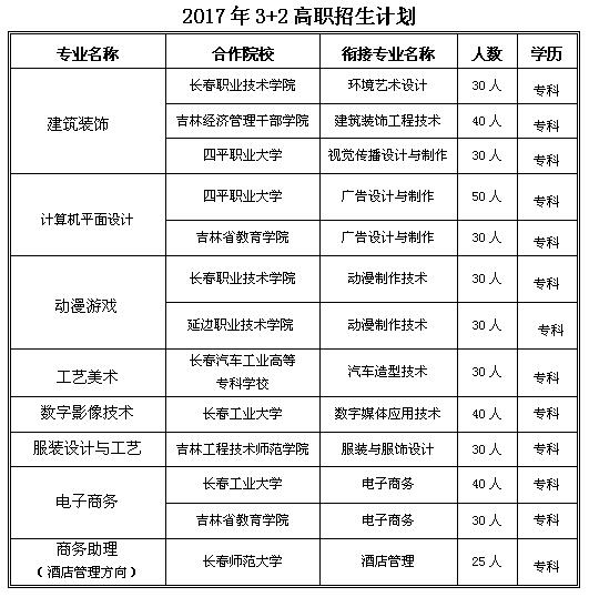 2.报考“3+2”中高职衔接项目的学生,必须是2017年长春地区应届初中毕业生,通过长春市招生信息网报名,达到录取分数,由长春市招生办统一录取,如有调整按照2017年吉林省教育厅下发的有关吉教职成〔2017〕相关文件执行。