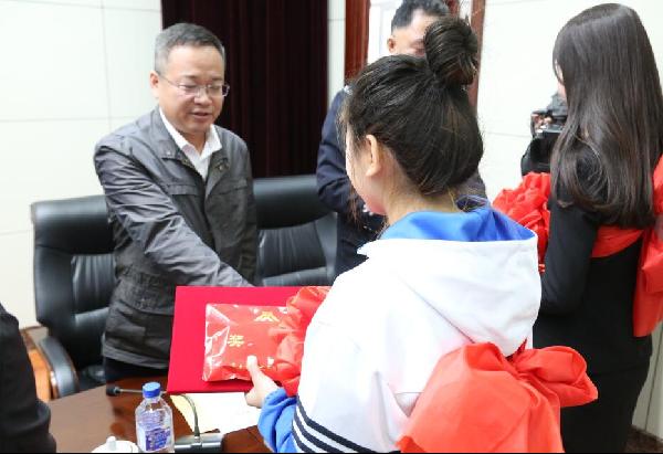 见义勇为基金会为贺婉婷同学颁发“见义勇为行为确认证明书”