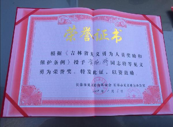 【事件回顾】今年3月5日早上6点左右,长春市第一中等专业学校的学生贺婉婷来到长春光华学院附近一家包子铺买早餐,进屋不久在店内工作的一对父女因燃气中毒突然晕倒在地上,贺婉婷在现场多次试图抢救并报警,随后她出门找到一名男子帮忙。根据店内监控录像显示,从6点09分店员晕倒到6点34分店员家属赶到现场抢救,贺婉婷始终没有放弃,其间她也因燃气中毒晕倒了几分钟。长春市见义勇为基金会4月2日,为贺婉婷同学颁发“见义勇为行为确认证明书”。